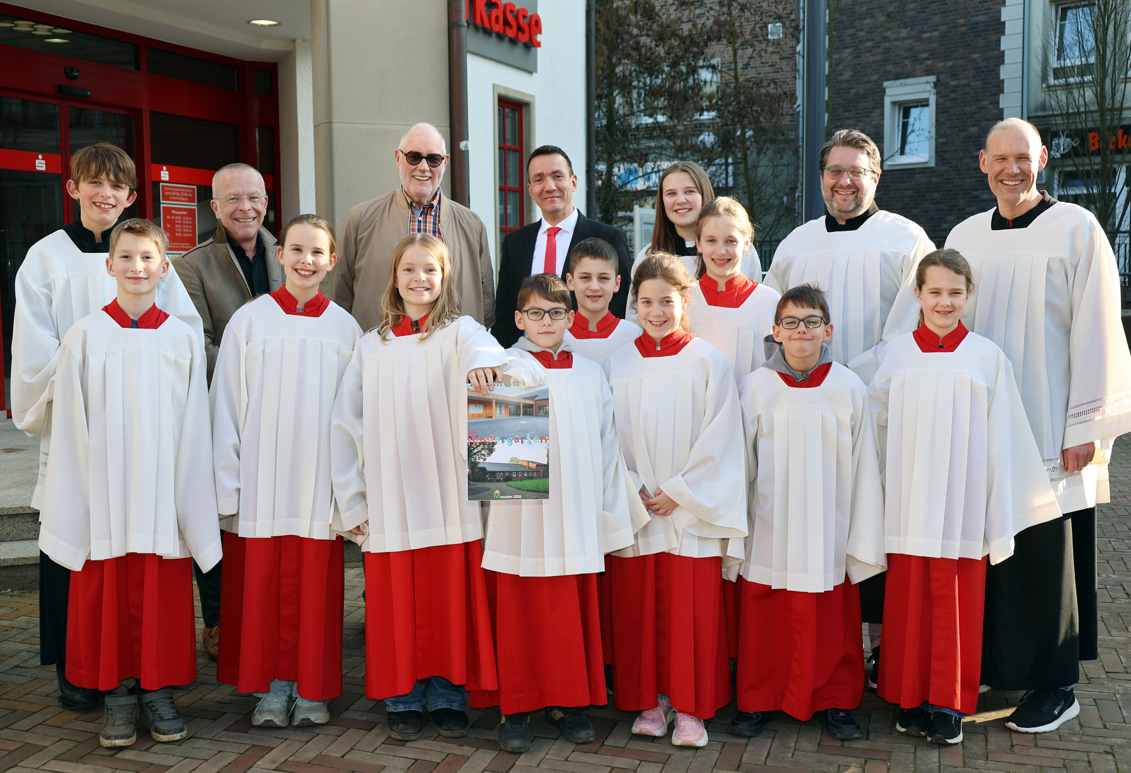 Die Menzelener Messdiener zeigen den Fotokalender, von dem Hans-Josef Angenendt (hinten, 3.v.l.) insgesamt 220 Stück verkaufen konnte. Den Erlös stockte die Sparkasse am Niederrhein mit einer Spende auf. Der Heimatfotograf konnte gemeinsam mit Geschäftsstellenleiter Tim Rütters (hinten, 4.v.l.) insgesamt 1.507,20 Euro an Pastor Dietmar Heshe (hinten, 2.v.l.). übergeben. Damit ist der diesjährige Tagesausflug der Messdiener gesichert.