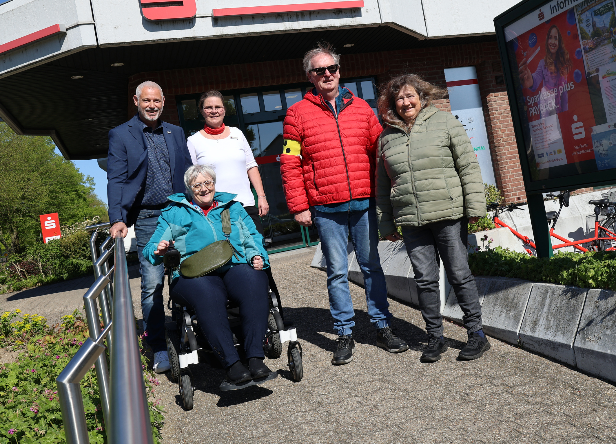 Sind zufrieden mit den neuen Geländern an der Sparkasse in Marienbaum (v.l.n.r.): Theo Neu, Regine Rennings und Melanie Koppers sowie Wolfgang und Monika Diamant.