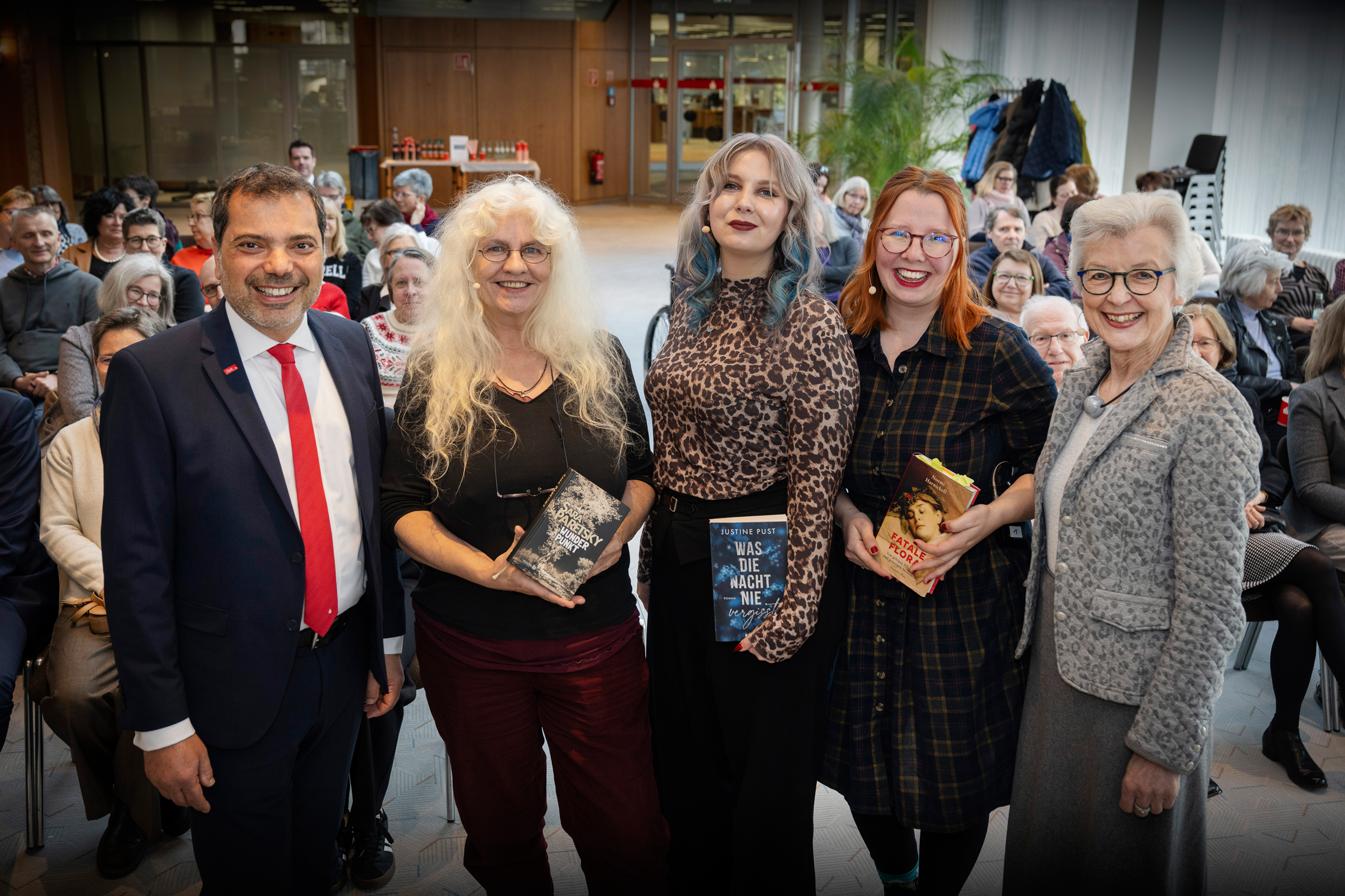MOERS. Zum Abschluss des 9. Moerser Krimifestivals begrüßte Sparkassenchef Giovanni Malaponti (v.l.n.r.) die Verlegerin Else Laudan sowie die Autorinnen Justine Pust und Noemi Harnickell. Dr. Rita Mielke moderierte die Gesprächs- und Leserunde zum Thema „Women in Crime“. Die weibliche Krimirunde vermittelte den rund 50 Zuhörerinnen und Zuhörern in der Kundenhalle der Sparkasse am Ostring spannende Einblicke in das Schaffen von Autorinnen und Publizistinnen. Die Runde diskutierte zudem über weibliche Rollenbilder im Krimigenre, und darüber, wie Lebensrealitäten von Frauen in die feministische Spannungsliteratur abgebildet werden.