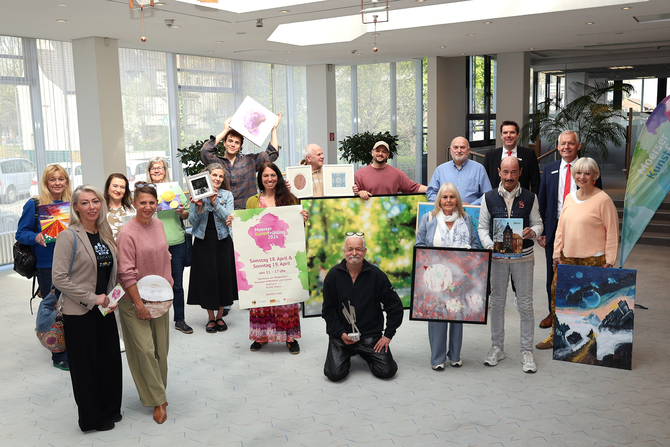 Bürgermeister Dirk Schauenberg (9.v.r.) war bei der Eröffnung der Stipendiatenausstellung ebenso unter den Besuchern wie der stellvertretende Landrat Dr. Peter Paic (ganz links). Hinten halten Sparkassenvorstand Bernd Zibell und Dozent Gerrit Klein einen Graffiti-Tag in die Höhe, links daneben: Markus Nacke, der Vorsitzende des Kuratoriums der Sparkassen-Kulturstiftung für Neukirchen-Vluyn.