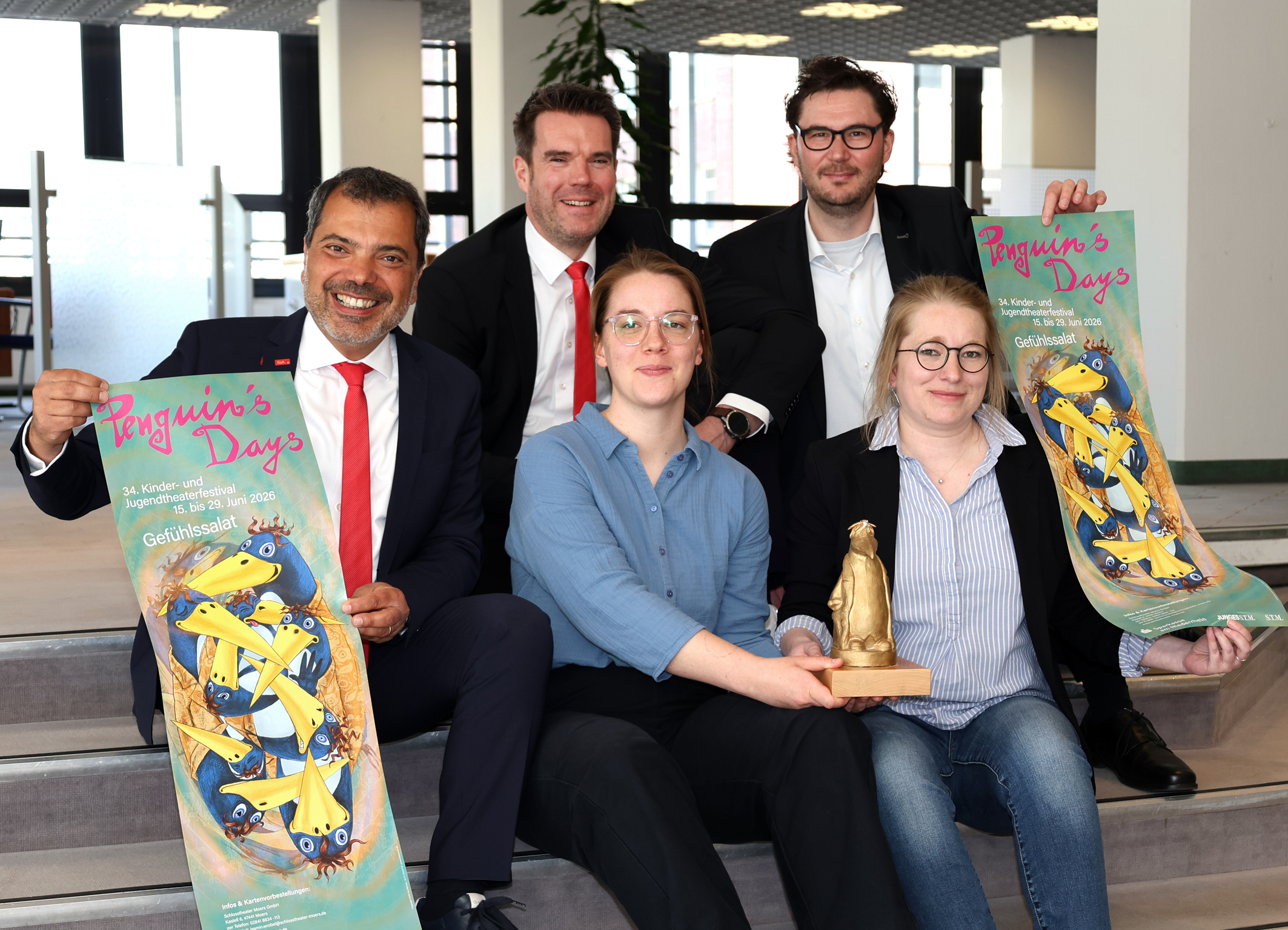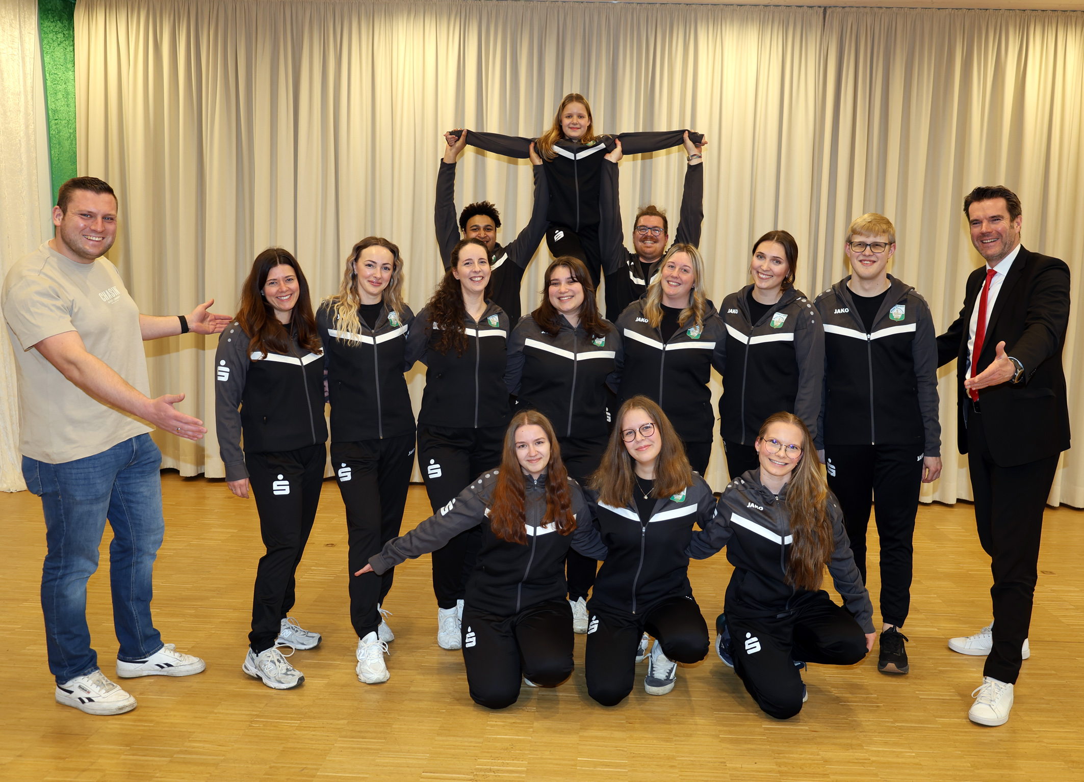 Für die Präsentation der neuen Trainingsanzüge der Tanzabteilung des Elferrates St. Marien Hochstraß hatte Präsident Lukas Klaffki (ganz links) Stefan Ertelt (ganz rechts) von der Sparkasse am Niederrhein eingeladen, die dafür eine Spende gegeben hatte.