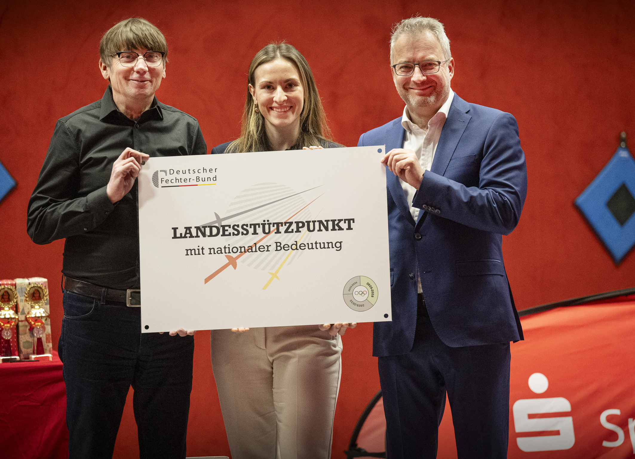 Besonderer Moment für den Fechtclub Moers: Julia Dörfer (Mitte), Referentin Leistungssport beim Deutschen Fechter Bund, und Marco Bez (rechts), Präsident des NRW Fechter-Bundes, überreichten Markus Tenbergen (Mitte) beim Sparkassen Cup die Auszeichnung ‚Landestützpunkt von nationaler Bedeutung‘.