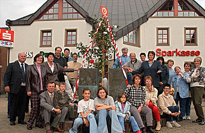 ALPEN. Der Geschichtsbrunnen vor der Geschäftsstelle der Sparkasse hat nun schon selber eine zehnjährige Geschichte. Als der damalige Vorstand der Sparkasse Moers den Brunnen vor dem neuen Wohn- und Geschäftshaus an der Burgstraße der Öffentlichkeit übergab, gründete sich spontan eine Brunnennachbarschaft, die bis heute festen Bestand hat. Am vergangenen Samstag schmückten die rund 20 aktiven Familien den Brunnen. Bürgermeister Wilhelm Jansen und die neue Geschäftsstellenleiterin in Alpen, Maria Deselaers, nahmen an einem kleinen Festakt anläßlich des Brunnenjubiläums teil.