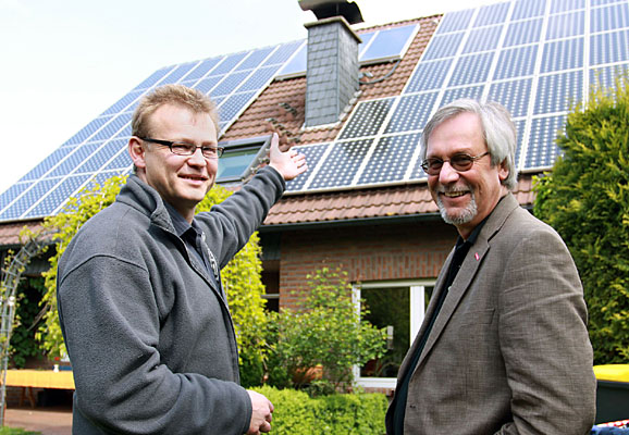 Wirtschaftsingenieur Frank Baumbach zeigt Kreishandwerksmeister Günter Bode die Sonnenkollektoren und Solarmodule, mit denen er Warmwasser und Strom produziert. Für die Installation und energetische Sanierung seines Hauses engagierte Baumbach örtliche Handwerksbetriebe, finanziert wurde alles mit einem Modernisierungskredit der Sparkasse am Niederrhein.