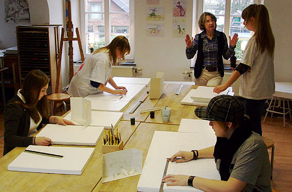 Die Kunstschule zeigt vom 8. bis zum 29. Oktober in der Sparkasse an der Poststraße eine Werkschau ihrer Stipendiaten. Das Bild zeigt Schulleiterin Gabriele Berndt-Bathen bei der Arbeit mit Kunstschülern.