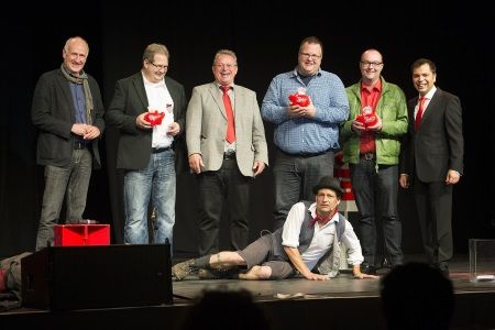 Viermal 250 Euro extra für die Vereinskasse, das ist ein guter Grund zum Lachen (v.l.n.r.): Bernhard Scheid (Freunde des Schlosstheaters), Carsten Kendziorra (TV Schwafheim 1900), Verwaltungsratsvorsitzender Karl-Heinz Reimann, Guido Menzel (DRK-Ortsverein Kapellen), Thorsten Krüger (für die Grünen Damen im Schloerstift) und Vorstandsvorsitzender Giovanni Malaponti. Vorne: Der Schweizer Komödiant This Maag.