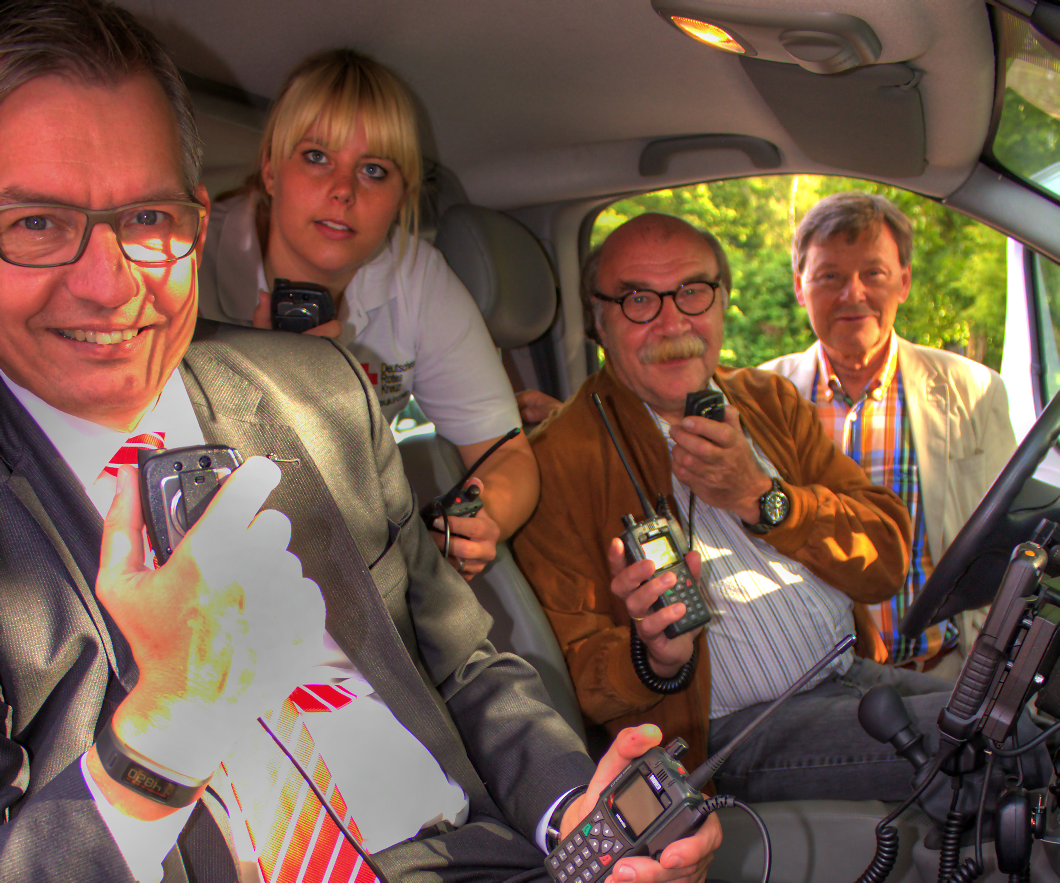 Probierten die neuen, digitalen Funkgeräte im DRK-Einsatzwagen aus (v.l.n.r.): Sparkassenvorstand Bernd Zibell, Bereitschaftsleiterin Sabrina Benger, Kuratoriumsvorstand Günter Zeller und der stellvertretende Ortsvereinsvorsitzende Winfried Schoengraf.
