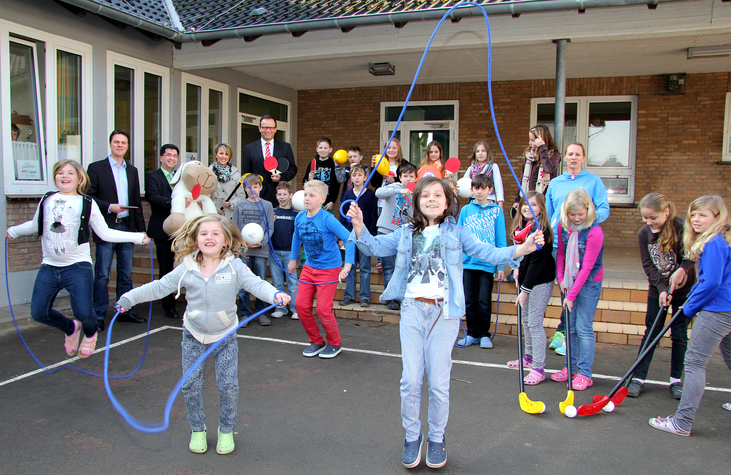RHEINBERG. Die Kinder der 4 b ließen es sich nicht nehmen, ihren Gästen die neuen Spiel- und Sportgeräte gleich einmal vorzuführen. Sparkassenvorstand Frank-Rainer Laake und Frank Tatzel schauten zu, wie die Mädchen und Jungen auf dem Pausenhof der Schule am Deich fröhlich Seil sprangen, Hockey spielten und die vielen neuen Bälle und Tischtennisschläger zeigten. „Bewegung wird an unserer Schule schon immer groß geschrieben“, so Konrektor Sebastian Bödeker. „Und Dank der 750 Euro von der Sparkasse am Niederrhein können wir den Kindern jetzt noch mehr Sportangebote machen.“