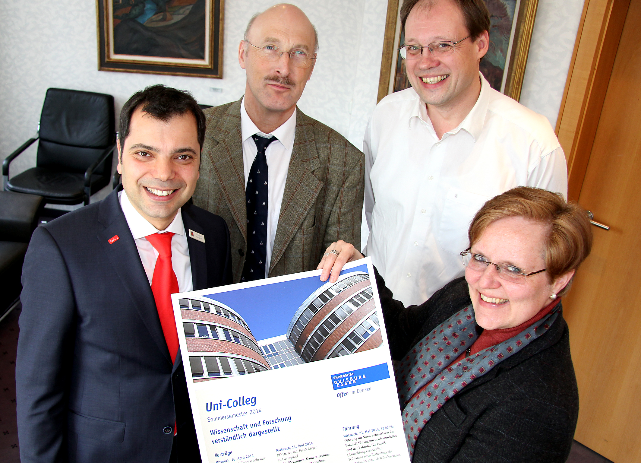 Stellten das Programm des Uni-Collegs in der Hauptstelle der Sparkasse am Niederrhein vor: Vorstandsvorsitzender Giovanni Malaponti, Professor Rolf Möller, Professor Roland Schmechel und Beate Kostka, Leiterin der Pressestelle der Universität Duisburg-Essen (v.l.n.r.).