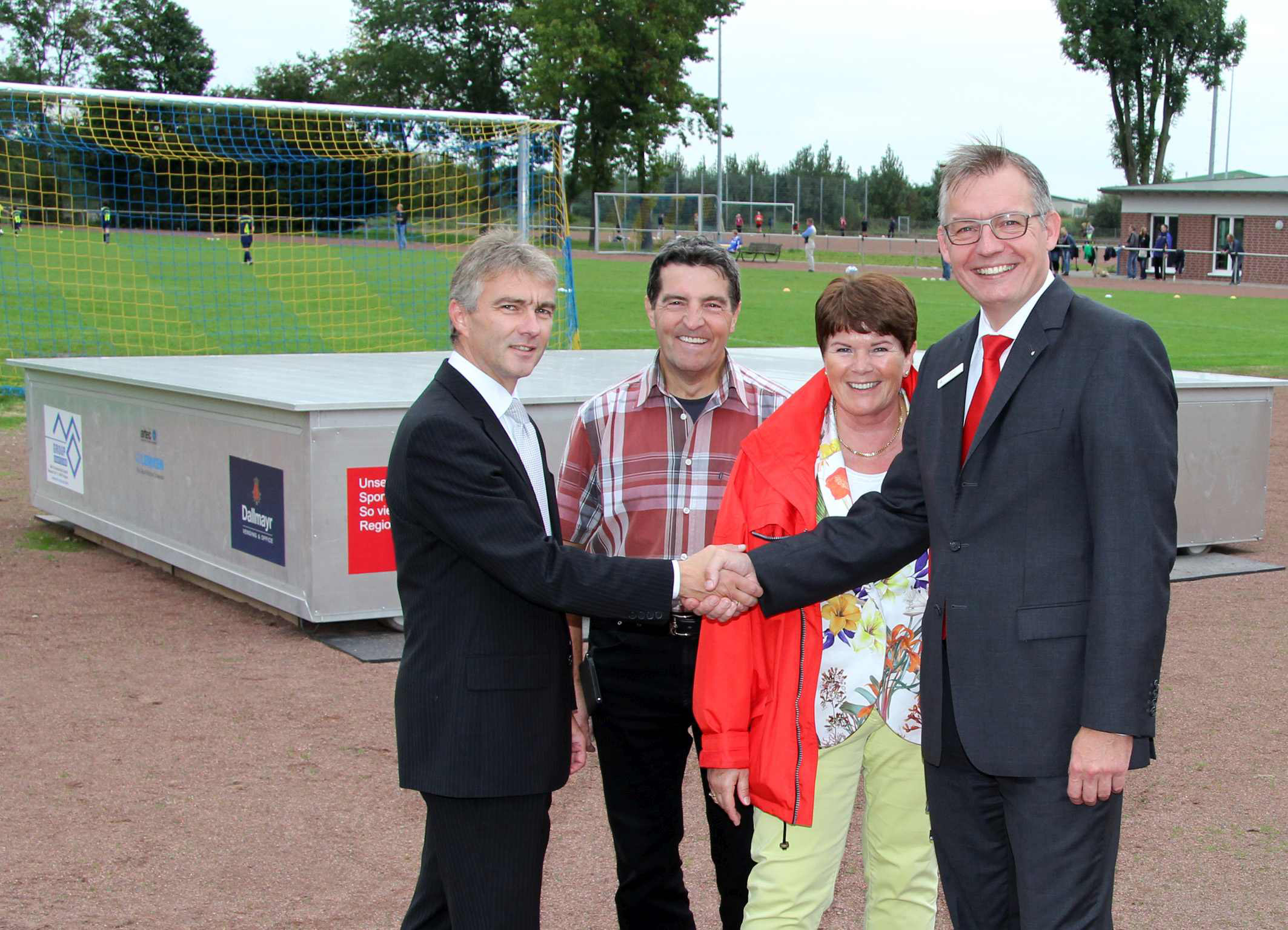 Abteilungsleiter Dietmar Paul und sein Stellvertreter Norbert Schulze zeigten Geschäftsstellenleiterin Maria Deselaers und Vorstand Bernd Zibell (v.l.n.r.) jetzt die reparierte Hochsprunganlage.