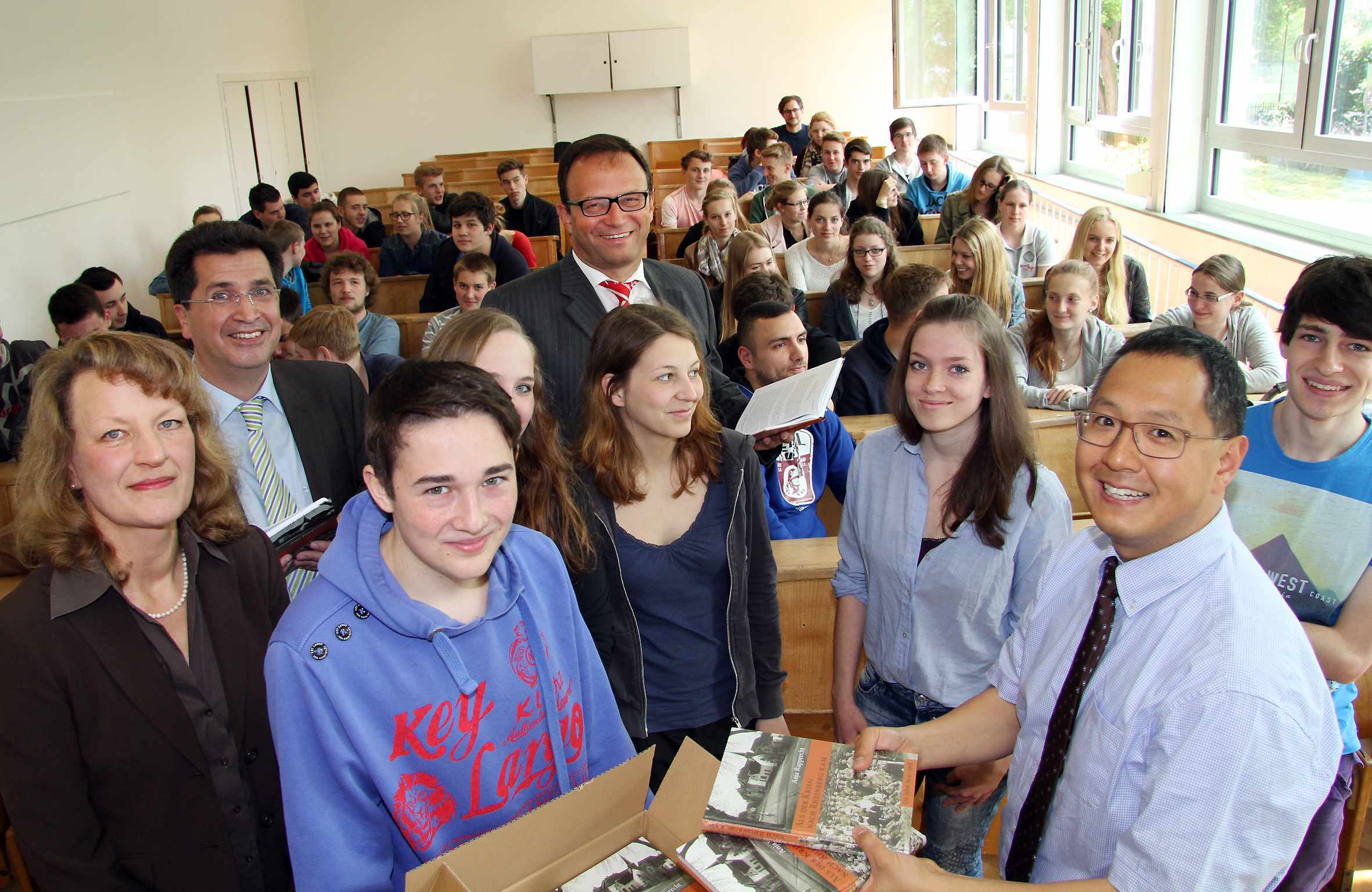 Anlässlich der Buchspende las Autorin Anja Rupprecht (l.) aus „Als der Krieg nach Rheinberg kam“. Frank Tatzel und Frank-Rainer Laake von der Sparkasse am Niederrhein (rechts daneben) überreichten Schulleiter Marcus Padtberg (r.) im Namen der Kulturstiftung 84 Exemplare, die zukünftig im Geschichtsunterricht eingesetzt werden.