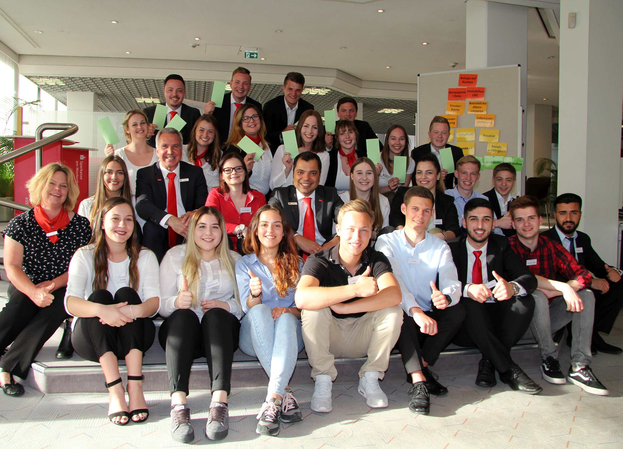 Die 15 neuen Auszubildenden der Sparkasse am Niederrhein erlebten einen ebenso lustigen wie spannenden Infoabend. Vorstandsvorsitzender Giovanni Malaponti (Mitte) sagte, „wir freuen uns wie Bolle auf Sie“. Auszubildende aus dem 3. Lehrjahr, die eine Modenschau und einige Theaterszenen präsentierten, zeigten die grüne Karte dazu.