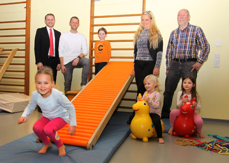 Mit einer Finanzspritzte der Sparkasse konnte der SV Concordia Ossenberg eine neue Kletterwand einbauen. Von der daran eingehängten Rollenrutsche sauste die vierjährige Nelly beim Besuch des Geschäftsstellenleiters Timm Ernicke (links). Den führten nach dem Foto Joel Willms, Ivonne Piazzolla und Burghard Kretschmer durchs Sportcenter an der Kapellenfeldstraße 7.