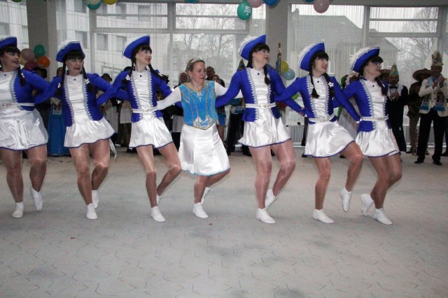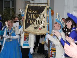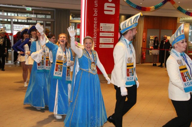 MOERS. Zum närrischen Empfang in der Sparkasse hatten Obermöhne Maria Driske und ihre wilden Weiber neben viel guter Laune und ihrem Möhnenlied eine Überraschung für Giovanni Malaponti mitgebracht: ein Nonnenkostüm. Das wurde dem Sparkassenchef vor rund 200 belustigten Närrinnen und Narren übergestreift, bevor Maria ihn mit gereimten Versen karnevalistisch piesackte. Beim einstündigen Besuch unterhielten die Möhnenschar und Prinzessin Melanie das Publikum mit ihren Schlagern und verteilten Orden. Die Elfengarde tanzte schwungvoll und Minister Daniel Bundschus vertrat den erkrankten Prinz Manuel in souveräner Manier.