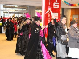 Überraschung beim Möhnen- und Prinzenempfang in der Sparkasse: Obermöhne Maria Driske (rechts) ermunterte ihre wilden Weiber dazu, Sparkassenchef Giovanni Malaponti (links) ein Nonnenkostüm anzuziehen. Prinzessin Melanie (rechts daneben) und mit ihr rund 200 Närrinnen und Narren in der Kundenhalle hatten ihre Freude daran.