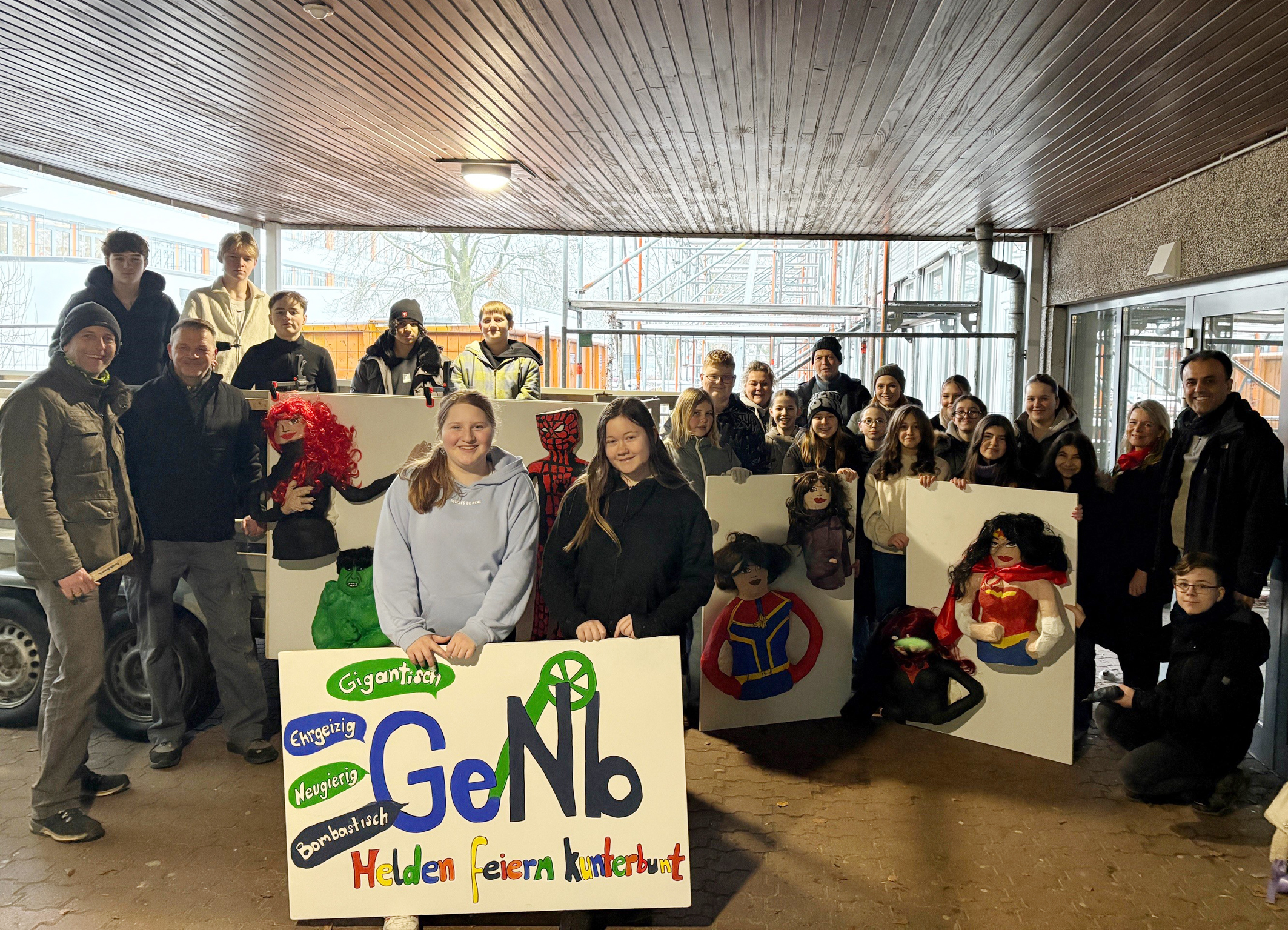 NEUKIRCHEN-VLUYN. Auf Schuldeutsch heißt das Ganze Ergänzungsunterricht. Ganz praktisch aber ist das, was Schülerinnen und Schüler der Gesamtschule Niederberg seit Wochen erleben kunterbunt und lebenspraktisch. Mit Drahtgeflecht, Papier, Leim, Holz und Akkuschraubern, aber vor allem mit ganz viel Phantasie arbeiten die Jugendlichen seit Wochen an ihrem eigenen Karnevalswagen. Das Motto lautet: „Helden feiern kunterbunt“. Kunstlehrerin Svenja Lepping-Heiliger: „Die Schülerinnen und Schüler haben ihre Superhelden ausgesucht und selbst kreiert. Diese Projektarbeit kommt sehr gut bei allen an und macht viel Spaß.“