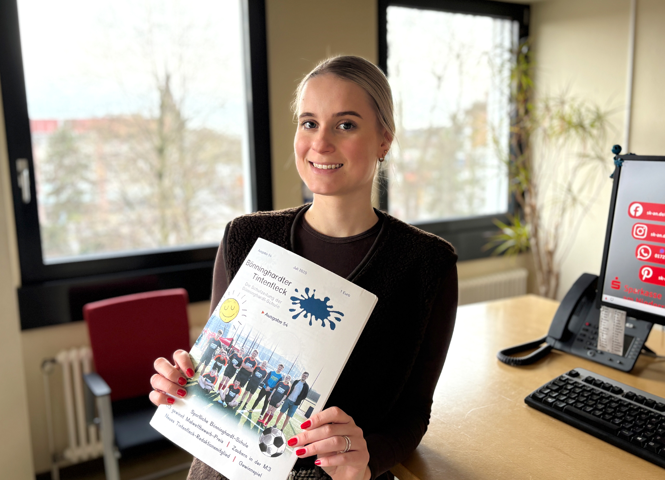 „In den vier Kategorien Grundschule, weiterführende Schulen, Förderschulen sowie Online-Zeitungen suchen wir wieder die besten Schülerzeitungen“, sagt Lena Kempken von der Sparkasse am Niederrhein und blättert in der neuesten Ausgabe des ‚Tintenfleck‘ der Alpener Bönninghardt-Schule.