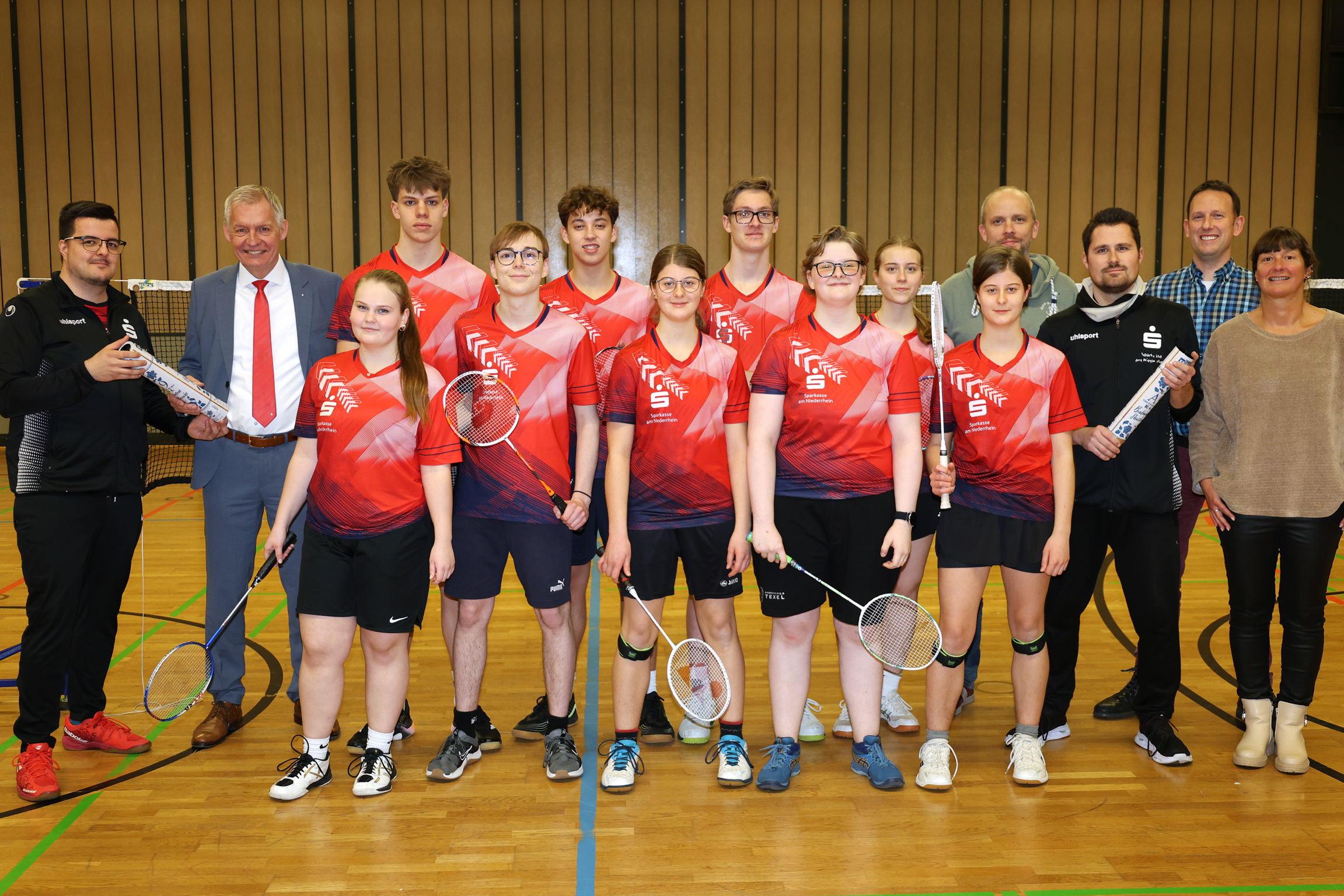 NEUKIRCHEN-VLUYN. Badminton ist der schnellste Sport der Welt. „Ballgeschwindigkeiten von über 400 Stundenkilometern wie die Profis erreichen wir nicht“, sagt Matthias Schröder und lacht. „Aber auch die Schläge unserer jugendlichen Spieler haben schon eine enorme Wucht“, ergänzt der Abteilungsleiter bei der Sportgemeinschaft Neukirchen-Vluyn. Und diese Wucht, so erfährt Sparkassenvorstand Bernd Zibell beim Trainingsbesuch, führe zwangsläufig zu einem hohen Verschleiß an Naturfederbällen. „Allein bei den acht Spielen eines Meisterschaftswettkampfs werden rund 24 Bälle verbraucht – und das bei einem Stückpreis von rund drei Euro“, berichten die Jugendtrainer David Paschmann und Jonathan Brammen.