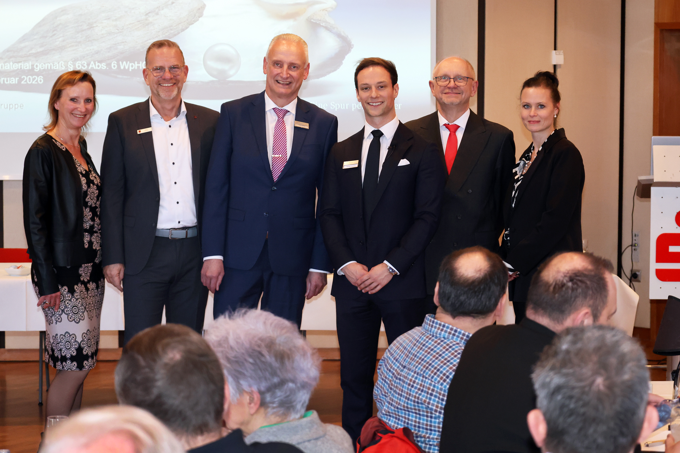 Portfolio-Manager Nicolas Gruschka (4.v.l.) informierte im Heinrich-Goldberg-Saal darüber, wie sich in unruhigen Zeiten eine umsichtige Vermögensverwaltung aufstellen sollte. Nach seinem Vortrag beantwortete der Referent von der Frankfurter Bankgesellschaft und sein Kollege Klaus Becker (3.v.l.) sowie Sandra Steinebach, Jörg Pöhler, Harald Schönherr und Ann-Christin Klein von der Sparkasse am Niederrhein die Fragen der Zuhörer.