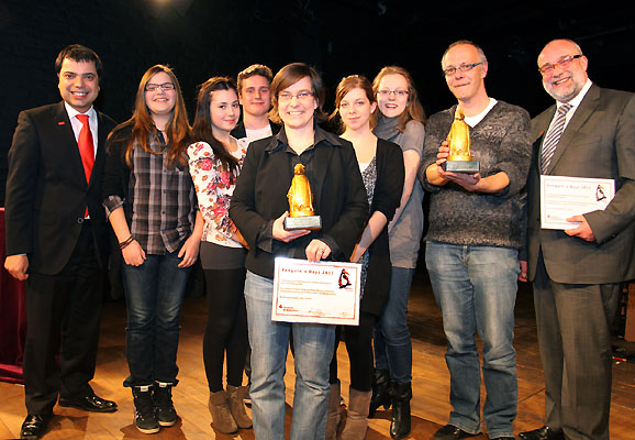 In der Lehrwerkstatt für Bäcker im Handwerklichen Bildungszentrum in Moers stellten Sparkassenvorstand Giovanni Malaponti und Kreishandwerksmeister Günter Bode die neue Kreditkarte vor. Hinten in der Mitte: Bäckermeister Volker Mays.
