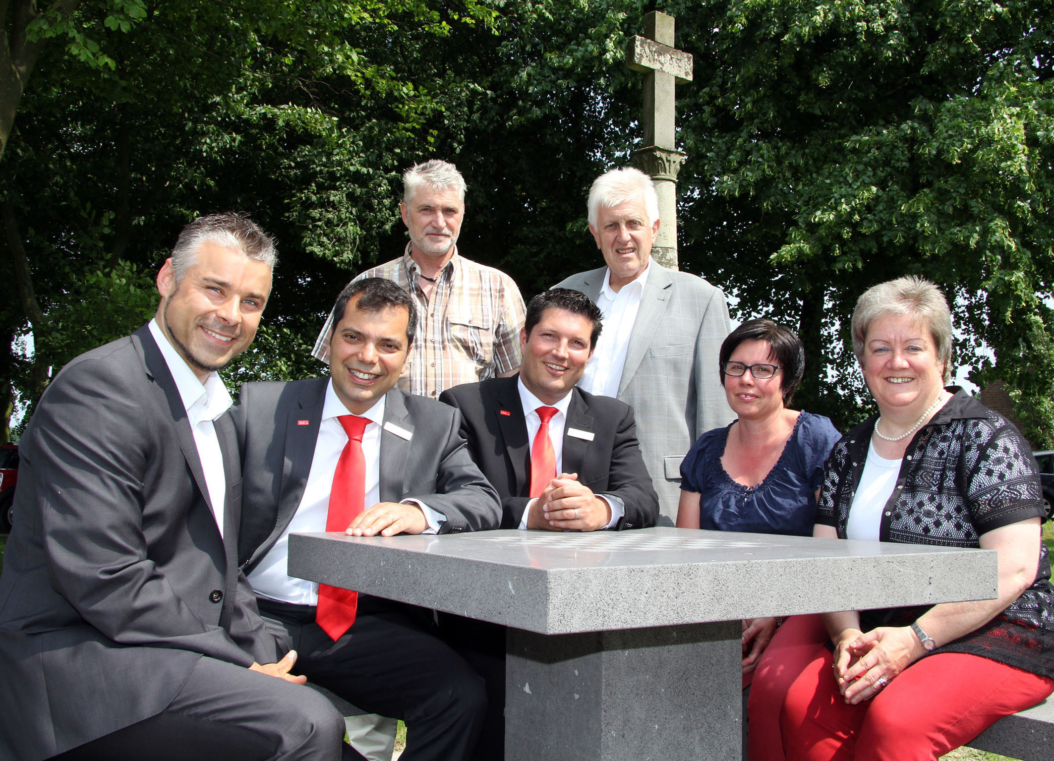 Im Beisein von Bürgermeister Leo Giesbers und seinem Nachfolger Heiko Schmidt sowie Giovanni Malaponti, Vorstandsvorsitzender der Sparkasse am Niederrhein, übergab die Vereinsgemeinschaft den nunmehr fertiggestellten Platz rund um das Pestkreuz der Öffentlichkeit. Von Steinmetz Reiner Weber aus Sonsbeck stammt die Sitzgruppe mit Tisch aus Basaltlava, an der Ausflügler eine kleine Pause einlegen können. „Franz Derksen und Sebastian Joosten haben hier ehrenamtlich gepflastert und damit einen schönen Platz für die Sitzgruppe geschaffen“, so Ortsvorsteherin Hildegard Pieper.