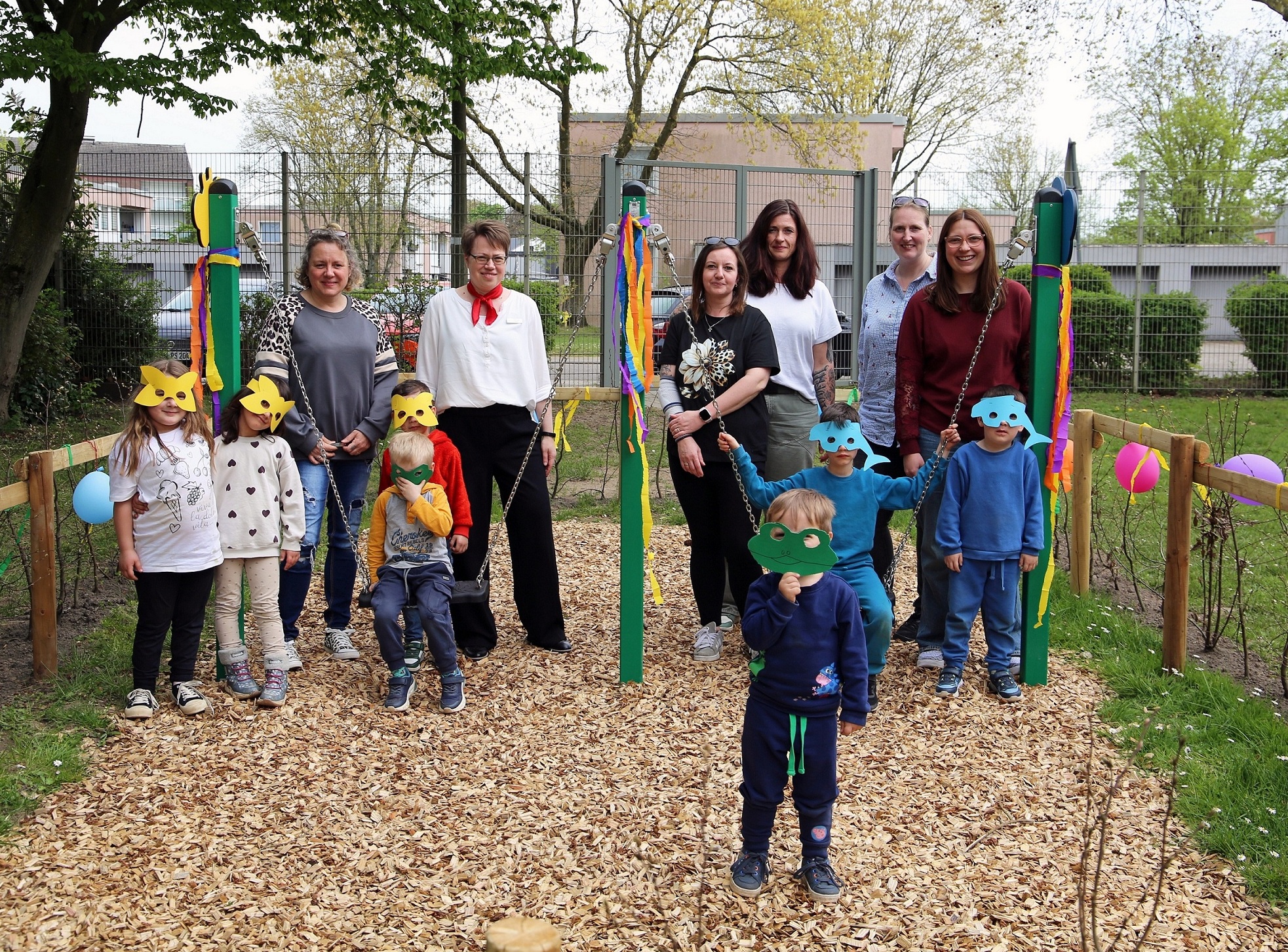 MOERS. In der Kindertageseinrichtung Pusenhof herrscht große Aufregung: Der Außenbereich wurde um eine neue Doppelschaukel erweitert. Nach der Einweihung durch Kita-Leitung Melanie Blumen-kamp und Christina Bauer von der Sparkasse am Niederrhein am Donnerstag, 9. April, testeten die Füchse, Delfine, Schmetterlinge und Frösche das farbenfrohe Spielgerät ausgiebig und mit sichtlicher Freude. Möglich gemacht wurde die Anschaffung durch die großzügige Unterstützung der Sparkasse am Niederrhein, die das Projekt mit einer Spende an den Förderverein der Kita in Höhe von 1.000 Euro maßgeblich gefördert hat. Mit der neuen Doppelschaukel wurde ein lang gehegter Wunsch erfüllt, der den Alltag der Kinder künftig noch abwechslungsreicher gestalten wird.