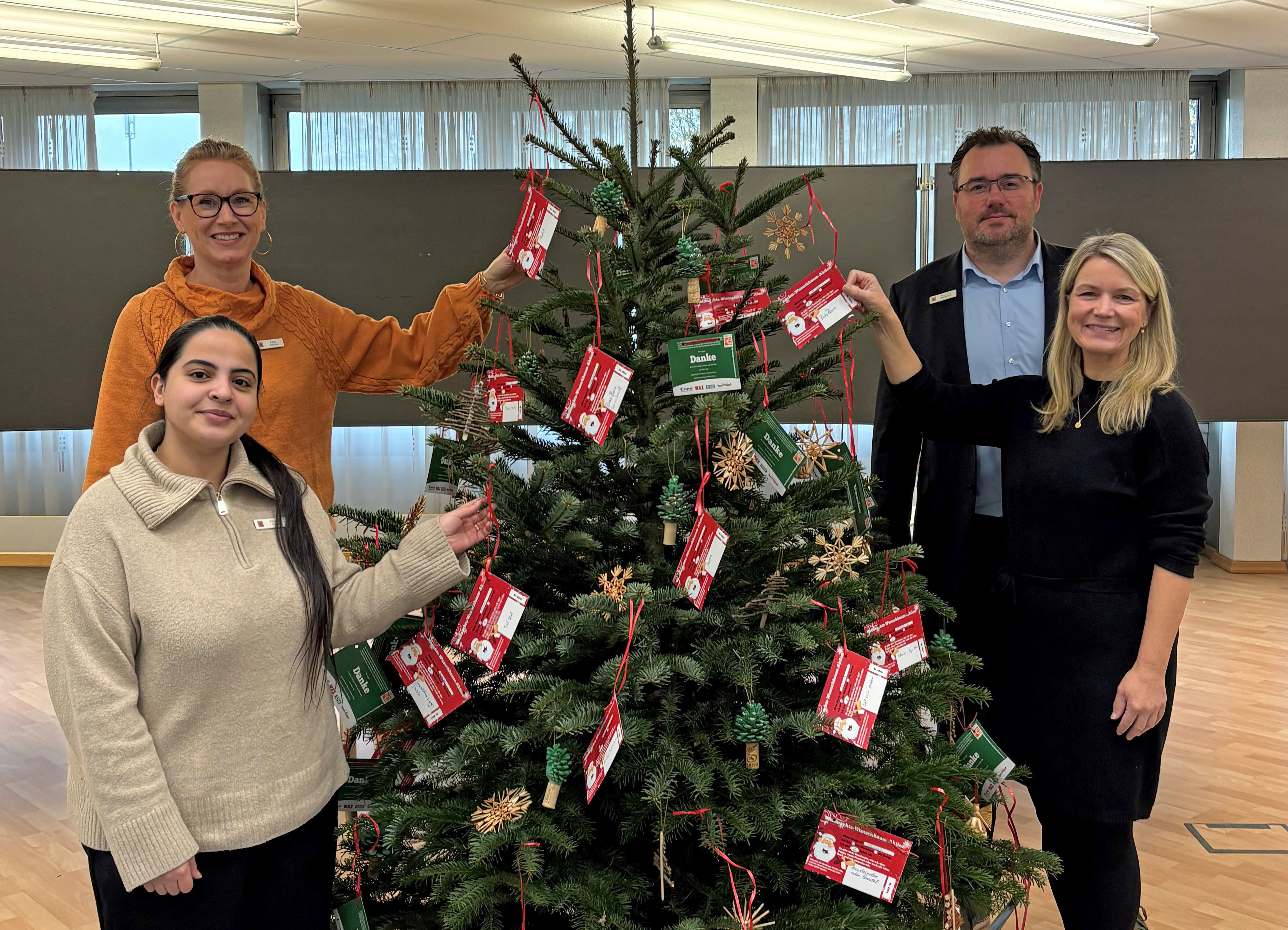 Den Wunschbaum des Vereins Klartext für Kinder hat das Team der Geschäftsstelle an der Poststraße um Katrin Steffans (ganz rechts) diesmal selbst geschmückt. Sie freuen sich auf viele Kunden, die die Wünsche der Kinder erfüllen möchten.