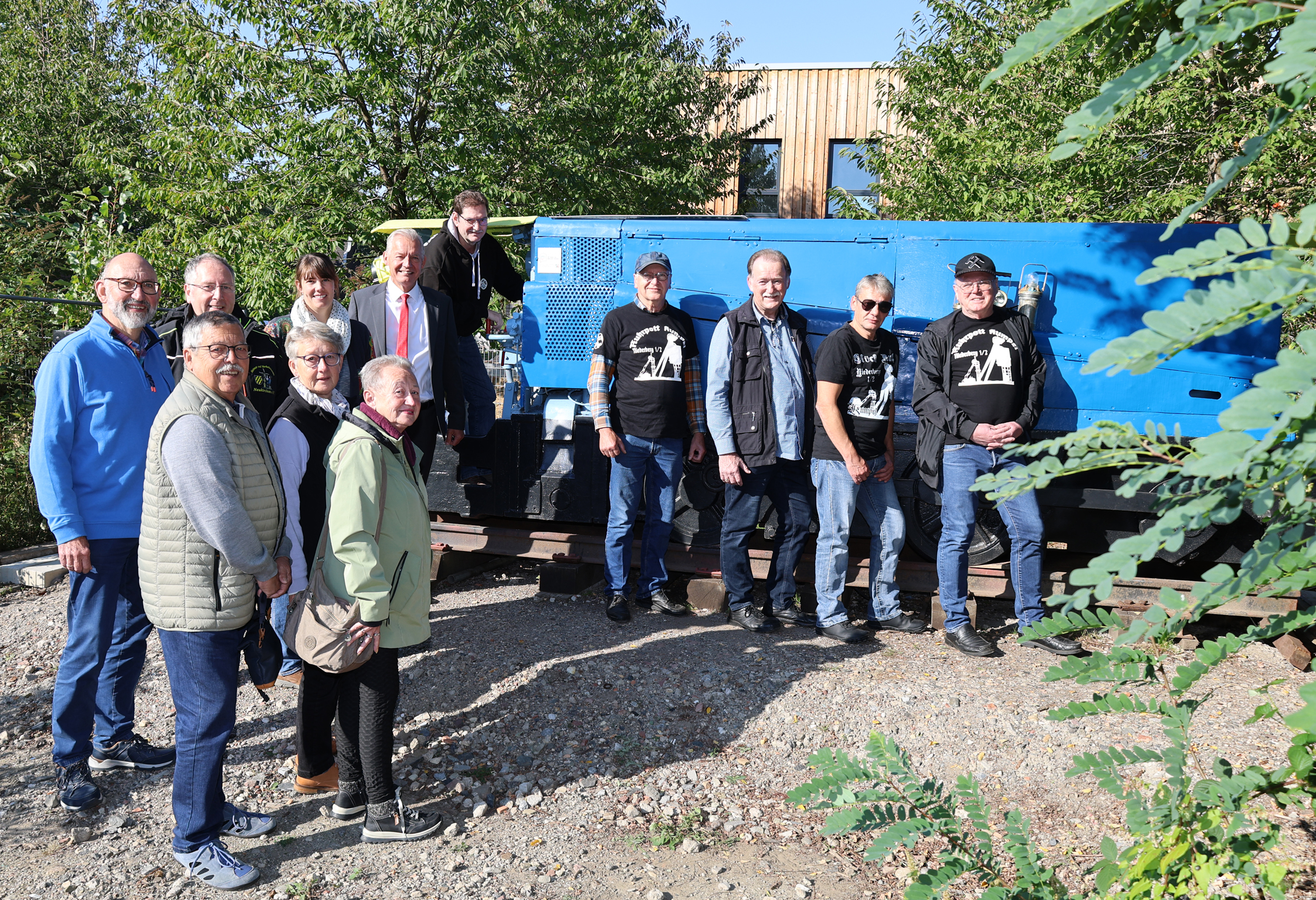 Die rund elf Tonnen schwere Grubenlok stammt aus dem Jahr 1954 und kann am Bendschenweg 36 vom Fußgängerweg am Kindergarten aus besichtigt werden. Darüber freuen sich Herrmann Düsterbeck, Dietrich Blumendahl, Elke Wimmer und Petra Hell (vorne, alle HHV Vluyn), dahinter Thomas Stralka (HHV Neukirchen), Museumsleiterin Dominique Walraevens und Sparkassenvorstand Bernd Zibell sowie die Schlosserkameraden Fritz Feldbaumer, Werner Hartmann, Jürgen Ermold, Jörg Spitz und Jupp Schröder.